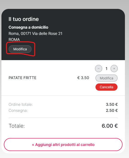 - Nella schermata di check-out dell’ordine, nella sezione di riepilogo ordine dove sono contenute tutte le informazioni, cliccare “modifica” sotto l’indirizzo per la consegna a domicilio