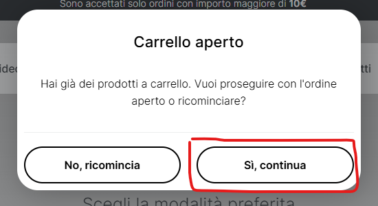 - la piattaforma riporterà alla schermata di scelta tra ritiro e consegna e farà visualizzare un pop-up che chiede se il carrello va svuotato o se si desidera continuare l’ordinazione. Cliccare “Sì, continua”