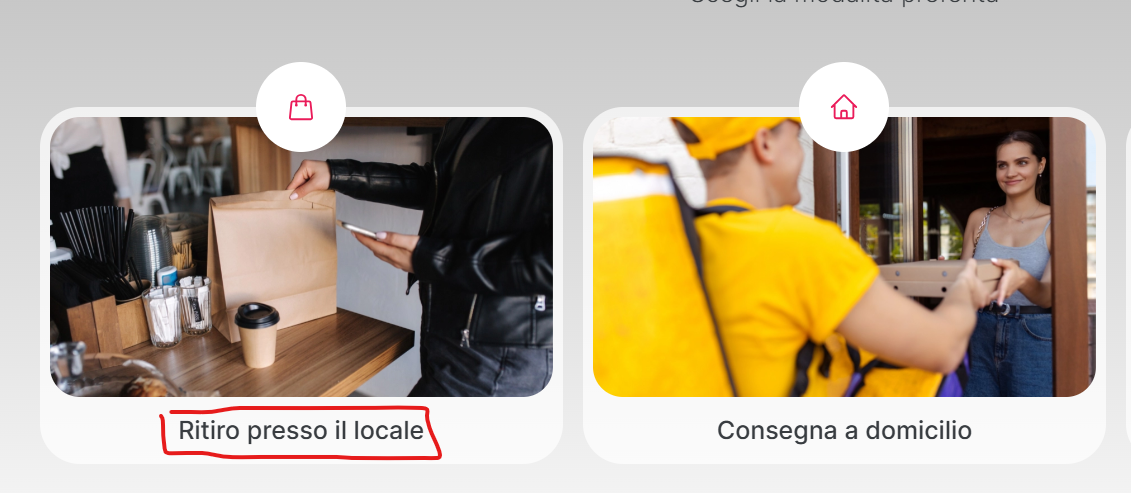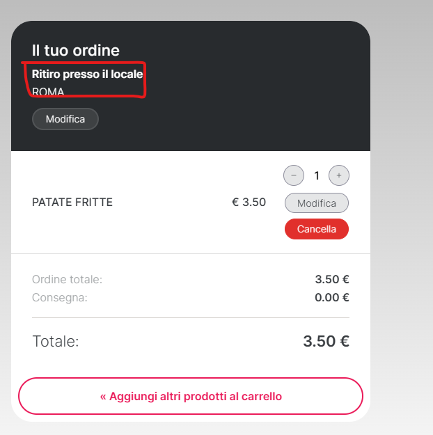 Se un cliente che sta ordinando in modalità self-order dalla piattaforma Ordina e che ha selezionato la modalità di “consegna a domicilio” decidesse in fase di check-out di cambiare da “consegna a domicilio” a “ritiro presso il locale”, seguire questi passaggi.